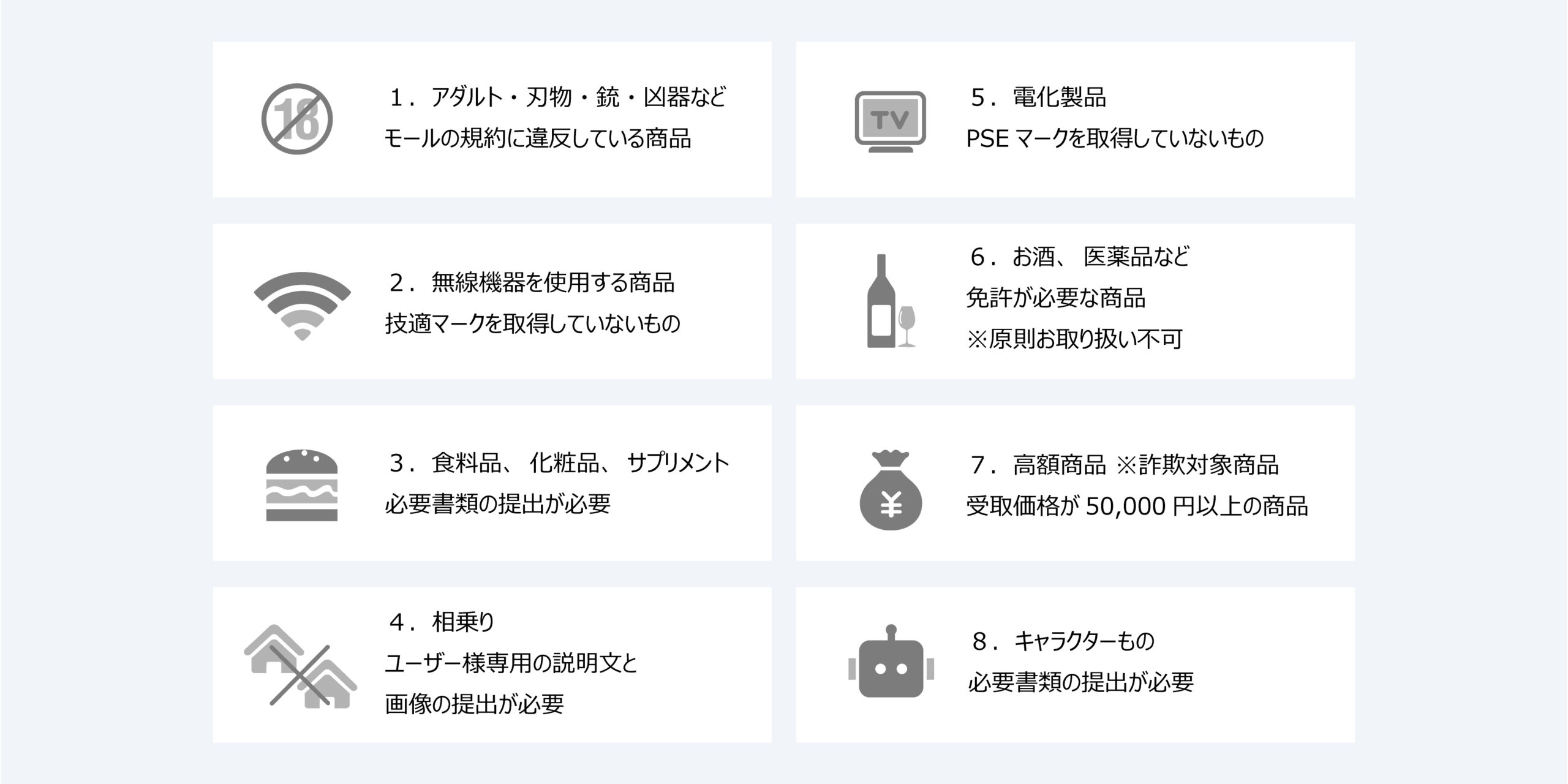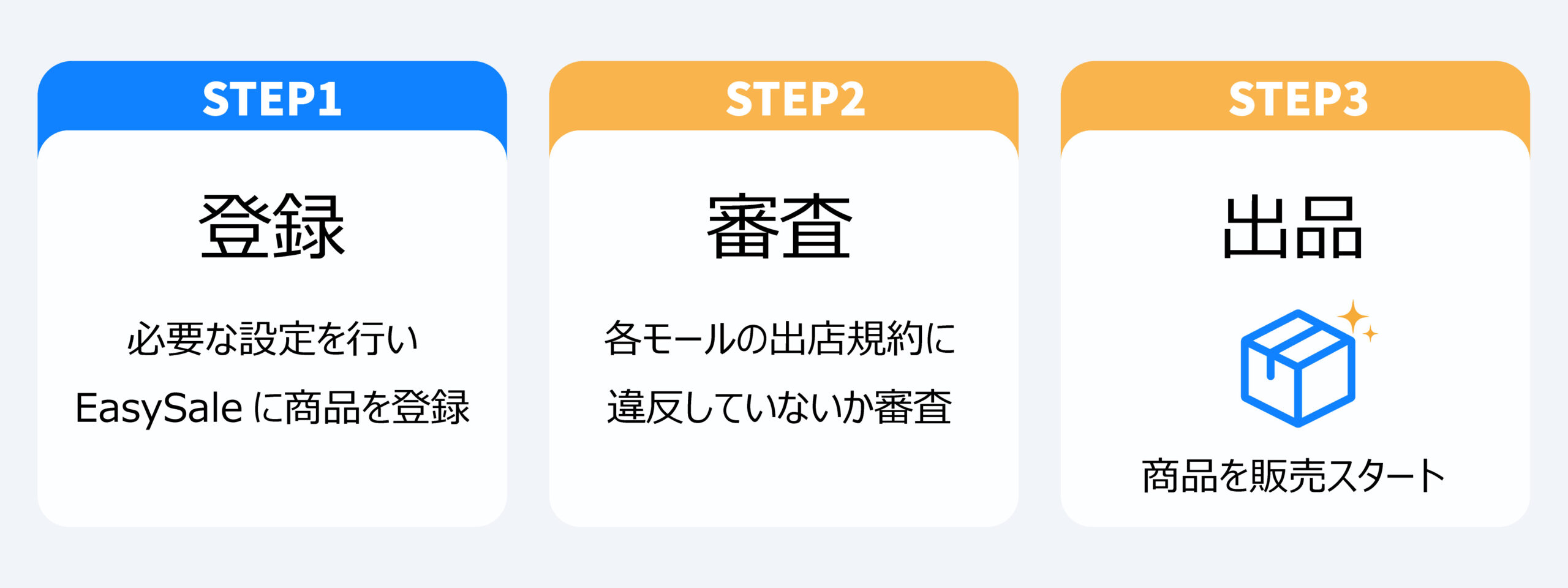 ※商品の審査・・・各モールの出店規約に違反していないかを確認します。審査結果により、出品を許可出来ない場合があります。例:アダルト商品、危険物(銃・ナイフ)