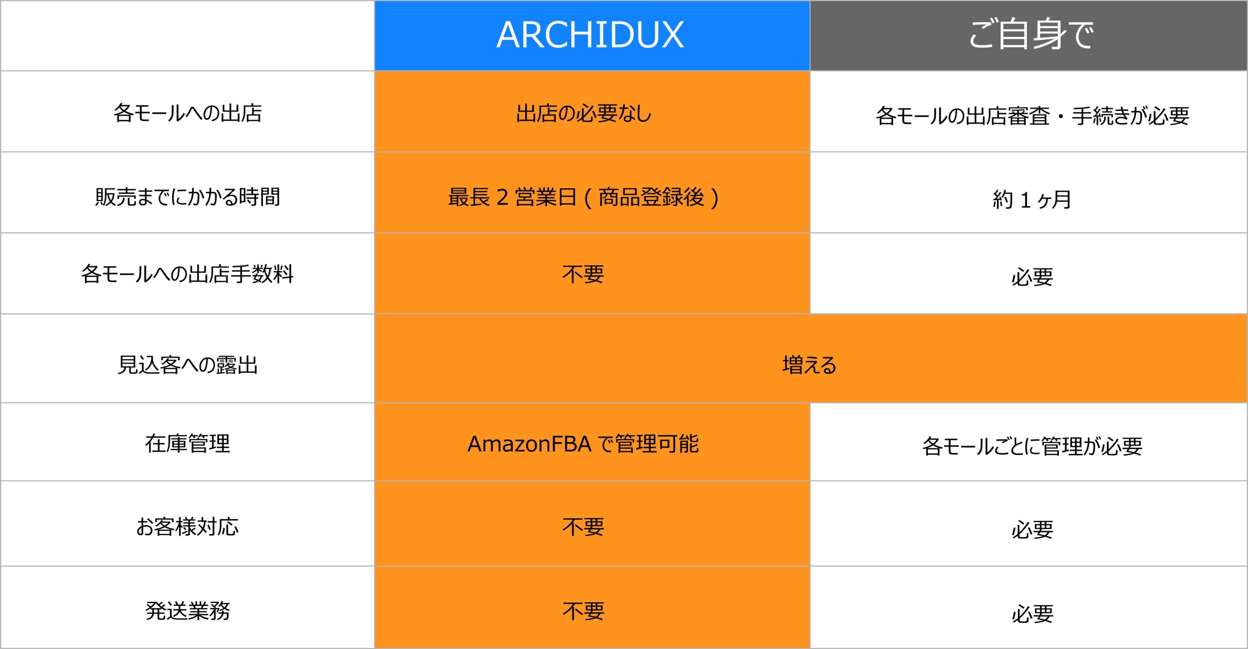 シンプルかつスピーディーにEC販売を完全自動化するプラットフォームです。初期費用は一切不要で、煩雑な開店手続きも不要です。どなたでも手軽にEC販売を始められます。特に、最短で当日から販売を開始できる点が大きな特長です。商品ページは自動で生成されるため、複雑な手続きをすることなく、スムーズに販売をスタートできます。ARCHIDUXで、より広い市場で売上拡大が期待できます。